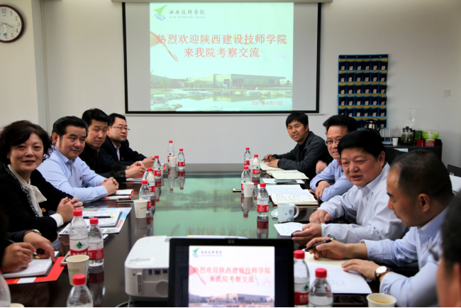 2017年4月17日,陜西建設(shè)技師學(xué)院院黨委書(shū)記、院長(zhǎng)岳嵐等一行13人來(lái)學(xué)院考察交流,學(xué)院院長(zhǎng)李長(zhǎng)江、副院長(zhǎng)楊廣明接待了來(lái)訪(fǎng)人員。