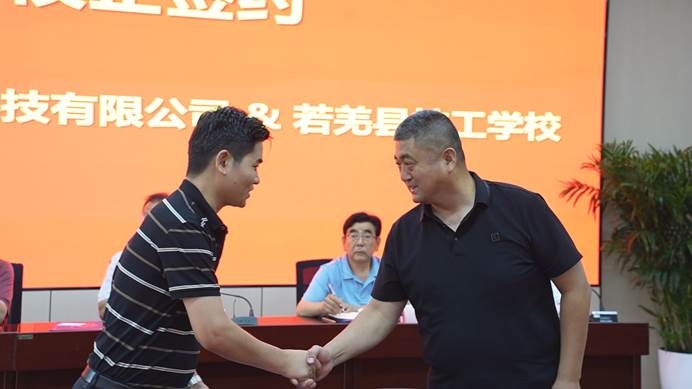 若羌縣技工學(xué)校黨委委員、副校長王延彬、阜康技師學(xué)院副校長鐘振紅分別與陜西天益教育科技有限公司副總經(jīng)理魏旬,簽訂了產(chǎn)教融合校企合作戰(zhàn)略合作協(xié)議。