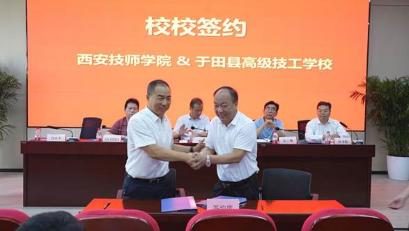 學(xué)院黨委書記、院長馮小平和陜西天益教育科技有限公司總經(jīng)理孫書陽向于田縣高級技工學(xué)校、澤普縣技工學(xué)校分別捐贈價(jià)值60萬元的教學(xué)儀器。