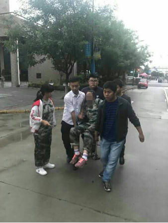 (圖為學(xué)生工作處處長(zhǎng)崔嵬(右一)帶領(lǐng)工作人員和學(xué)生抬著受傷學(xué)生去醫(yī)院接受治療)