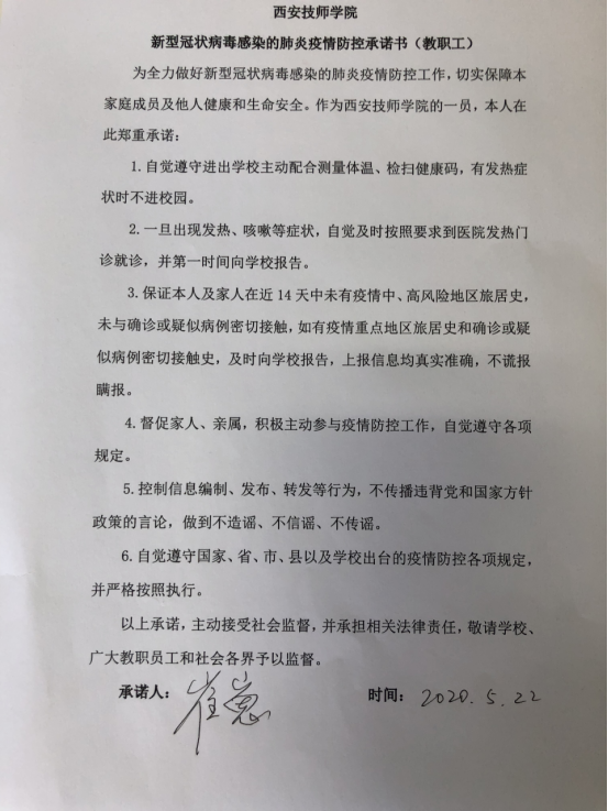 2020年春季即將開(kāi)學(xué),為保障學(xué)院開(kāi)學(xué)后防控新型冠狀病毒工作能夠順利進(jìn)行。2020年5月21日,學(xué)院辦公室組織簽署新冠狀病毒感染的肺炎疫情防控承諾書。