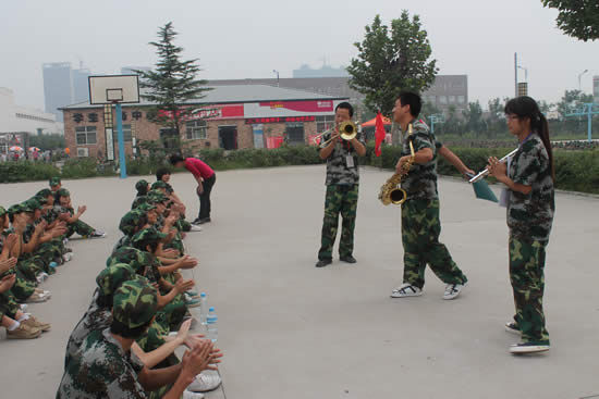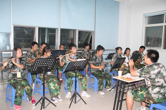 在軍訓(xùn)場(chǎng)地上,有一群這樣的人,他們手拿長(zhǎng)笛、沙克斯、黑管、小號(hào)……用這樣的裝備為我們的新兵加油助威。