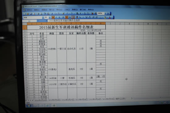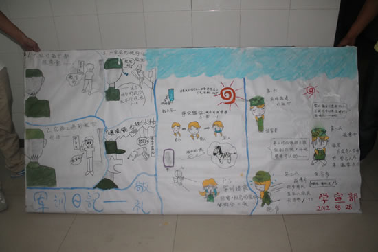 即便如此,仍有不如人意的地方:天公不愿作美,兩場(chǎng)暴雨將國(guó)旗下的營(yíng)連評(píng)比專欄洗刷干凈,和教官協(xié)商后,按其要求重新制作。為了融合90后新生的審美情緒,宣傳欄在設(shè)計(jì)之初就以漫畫(huà)作為主體,拒絕死板,貼近學(xué)生。同學(xué)們對(duì)軍訓(xùn)感想和日志的關(guān)注度很高,每天我們都對(duì)各系室報(bào)送的稿件進(jìn)行審稿和統(tǒng)計(jì),為優(yōu)秀學(xué)員和先進(jìn)集體的評(píng)比提供數(shù)據(jù),也為同學(xué)們創(chuàng)建一個(gè)展示自我的平臺(tái)。