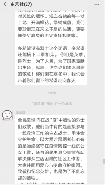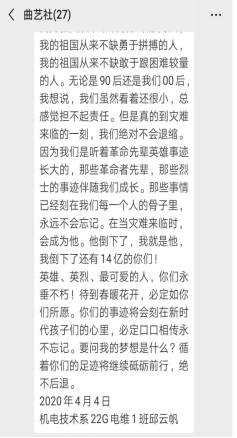 本次悼念活動(dòng)分為兩部分:1.在早晨九點(diǎn)五十之前在微信群發(fā)布緬懷先烈文字,向疫情期間犧牲的最可愛的人致敬;2.全體社團(tuán)成員在家衣著整齊,十點(diǎn)整進(jìn)行默哀儀式。