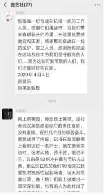 2020年4月4日,按照學(xué)院相關(guān)工作通知,西安技師學(xué)院曲藝社在社長邱云帆的指導(dǎo)下,開展了以文字和實(shí)際行動(dòng)對(duì)抗擊新冠肺炎犧牲烈士及逝世同胞進(jìn)行悼念的活動(dòng)。