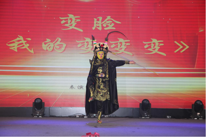 現(xiàn)代服務(wù)系學(xué)生趙特為大家?guī)砹思俭@四座的川劇變臉表演,以魔術(shù)般的技法,變幻出形態(tài)各異的臉譜,并穿梭于臺上臺下,在全場觀眾的歡呼中,演繹著變臉絕技的神奇與魅力。