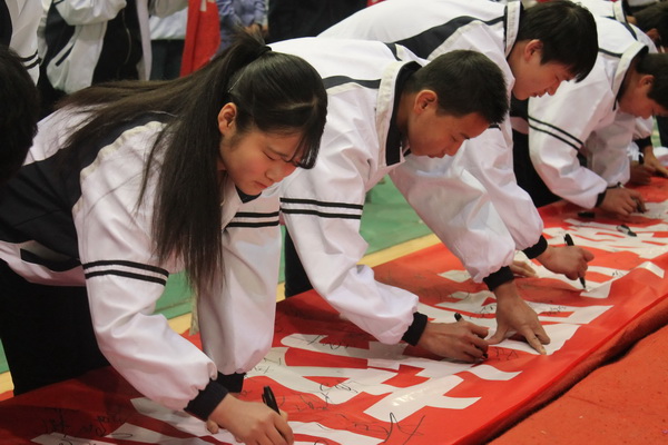 同學(xué)們依次在橫幅上簽下自己的姓名