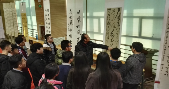 墨香書法社團(tuán)曹恒源同學(xué)向李院長及各位參觀領(lǐng)導(dǎo)講解參展作品