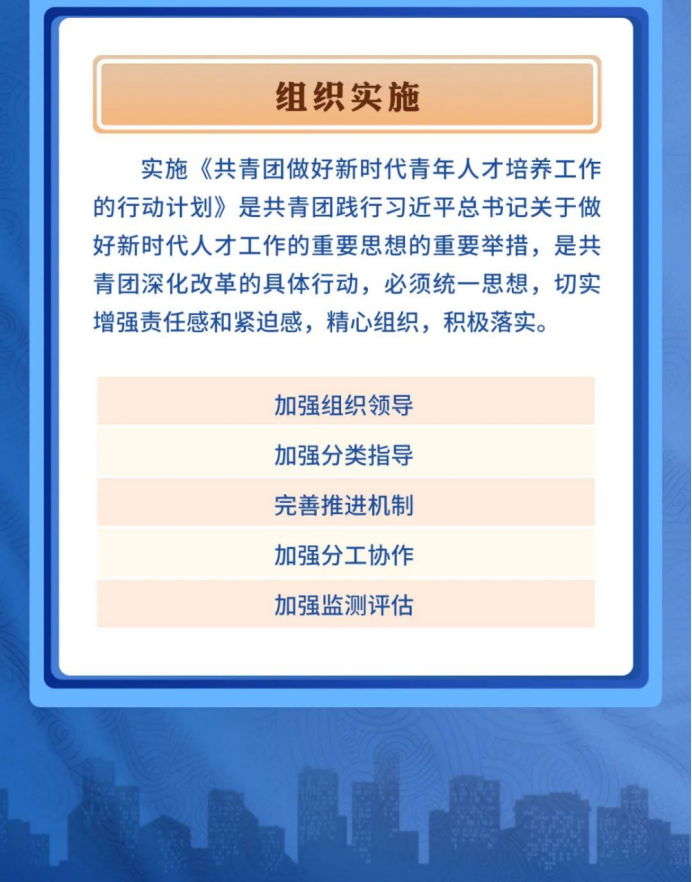 為深入貫徹習(xí)近平總書(shū)記在慶祝中國(guó)共產(chǎn)主義青年團(tuán)成立100周年大會(huì)上的重要講話精神、習(xí)近平總書(shū)記關(guān)于做好新時(shí)代人才工作的重要思想和中央人才工作會(huì)議精神。近日,共青團(tuán)中央印發(fā)了《共青團(tuán)做好新時(shí)代青年人才培養(yǎng)工作的行動(dòng)計(jì)劃》,并發(fā)出通知,要求各省級(jí)團(tuán)委、各行業(yè)團(tuán)(工)委抓好貫徹落實(shí)。