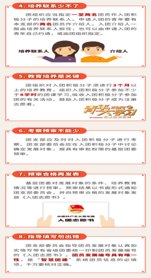 團章規(guī)定,年齡在十四周歲以上,二十八周歲以下的中國青年,承認團的章程,愿意參加團的一個組織并在其中積極工作、執(zhí)行團的決議和按期交納團費的,可以申請加入中國共產主義青年團。那么,發(fā)展團員的流程是什么呢?用一張圖告訴你!
