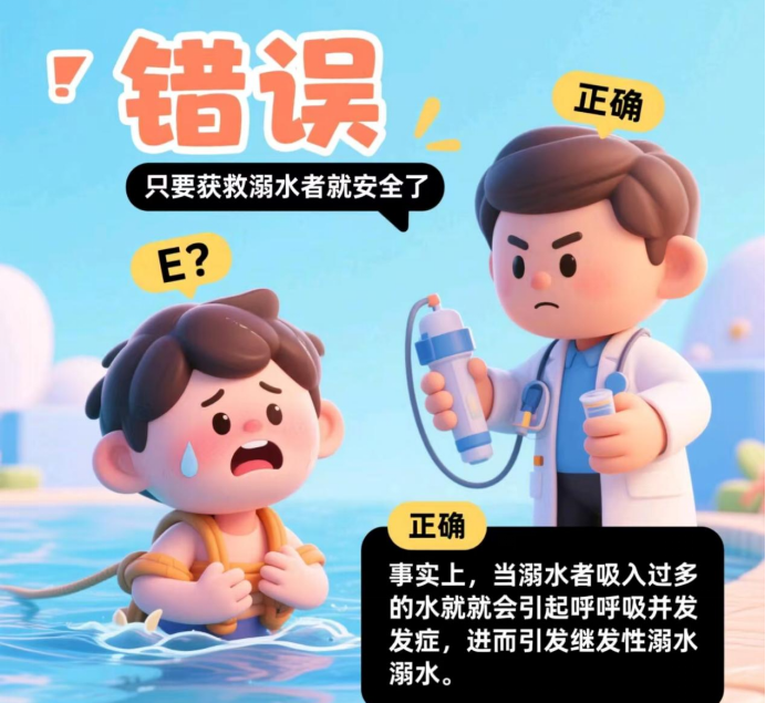 (√)事實上,當溺水者吸入過多的水就會引起呼吸并發(fā)癥,進而引發(fā)繼發(fā)性溺水或干溺水。此時,哪怕溺水者已經獲救上岸,如果不及時跟進治療,液體積聚仍會導致呼吸窘迫,腦損傷(腦缺氧)甚至心搏驟停。