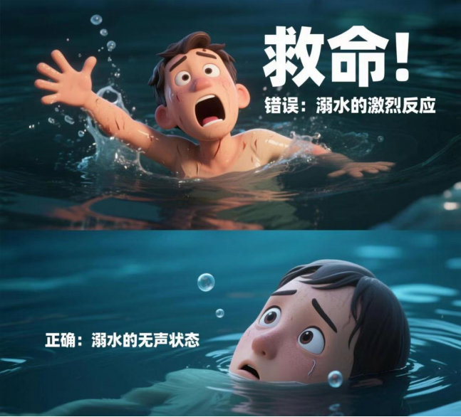 (√)事實上,溺水大多數悄然發(fā)生,溺水時,吸入空氣是第一需求。當人的口鼻在慌亂中短暫浮出水面,受本能驅使只會全力吸氣,此時會有大量水嗆入氣管,根本來不及發(fā)聲。