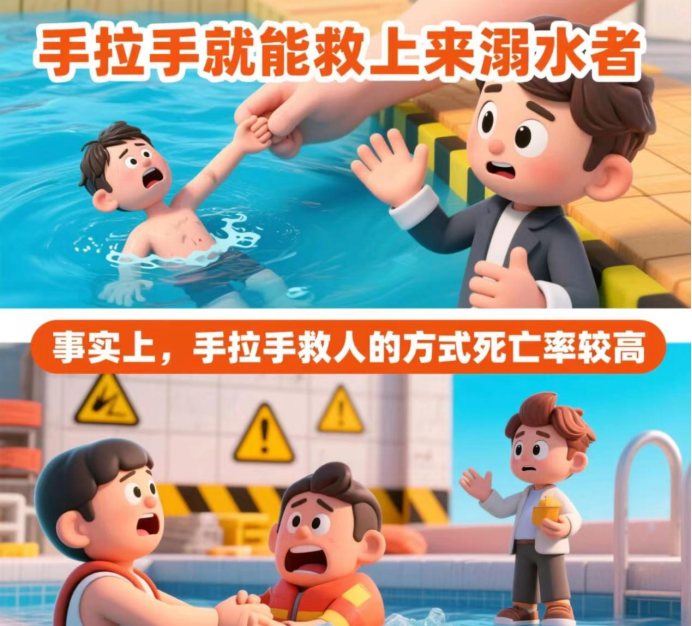 (√)事實上,一般情況下,一個人從落水到溺亡只需要2~5分鐘。如此短的時間內。要實施有效救援,要么正好附近有長桿、漂浮物等有效工具,要么附近有較強游泳及施救能力的施救者(非專業(yè)人士下水救援危險性較大)。大家仔細想一想,具備這幾種條件的概率能有多大?