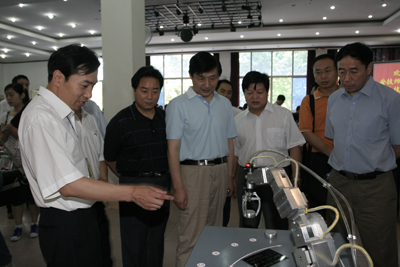 陜西省勞動和社會保障廳副廳長沙德憲(左三)、培訓處處長雷云(左二)在學院院長李長江(右二)的陪同下觀看學院預備技師畢業(yè)生制作的多功能機械手