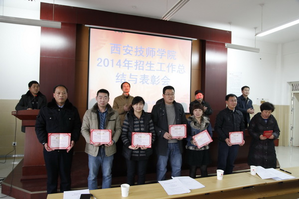 2014年12月2日下午,學(xué)院“2014年招生工作總結(jié)暨表彰大會(huì)”,在西安技師學(xué)院咸陽校區(qū)C座301室樂學(xué)堂召開。參加本次大會(huì)的有院長(zhǎng)李長(zhǎng)江、副院長(zhǎng)王德意 、紀(jì)委書記兼副院長(zhǎng)袁建章、副院長(zhǎng)趙輝以及全體教職工,大會(huì)由王德意副院長(zhǎng)主持。