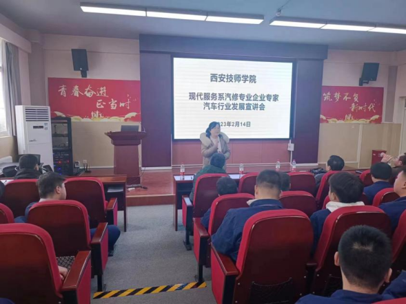 崗位實習前,現(xiàn)代服務(wù)系副主任冀芳、西安市汽車協(xié)會會長張光明以及6家企業(yè)人力資源負責人參加汽修專業(yè)學生崗位實習動員會。