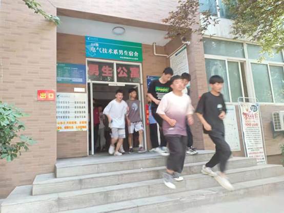 演練期間,學(xué)生們在宿舍聽到逃生信號,應(yīng)急管理人員組織學(xué)生從各自公寓樓內(nèi)有序向集結(jié)點(diǎn)撤離,班主任、教官斷后逐個(gè)清理樓層,最后撤離現(xiàn)場。