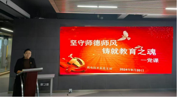 為進(jìn)一步推進(jìn)師德師風(fēng)建設(shè),落實(shí)立德樹人目標(biāo),加強(qiáng)教師教書育人的責(zé)任感、使命感、榮譽(yù)感,規(guī)范教師職業(yè)行為,激發(fā)教師對教育工作的熱情,打造一支“有理想信念、有道德情操、有扎實(shí)學(xué)識、有仁愛之心”的教師隊伍,9月20日下午,機(jī)電技術(shù)系黨支部書記張琳娜以“堅守師德師風(fēng)、鑄就教育之魂”為主題,為全體黨員講授了一節(jié)專題黨課。